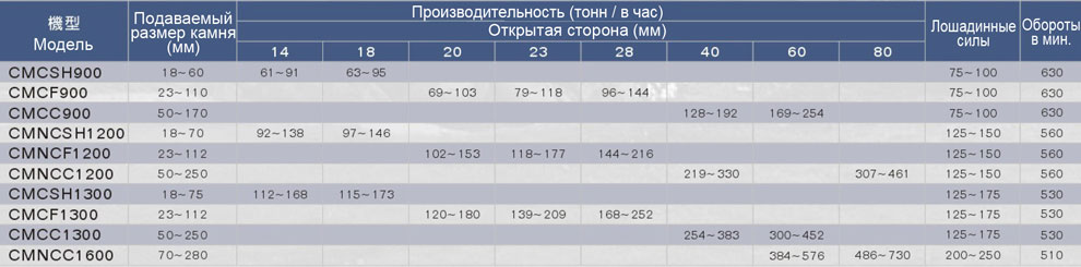 Все три типа предназначены для второй и третьей стадии дробления высокоабразивных материалов как на стационарном, так и передвижном оборудовании. Модели 1200 и 1600 имеют новую конструкцию, и все три типа (NCC, NCF, NCSH) имеют большую производительность, меньший вес и сниженное энергопотребление. NCHS - тонкого дробления, NCF - среднего и мелкого дробления, NCC - грубого дробления. Модель NCC применяется для второй стадии дробления. Модель NCF применяется для третьей стадии дробления. Модель NCHS используют для измельчения материала крупностью выше заданной.